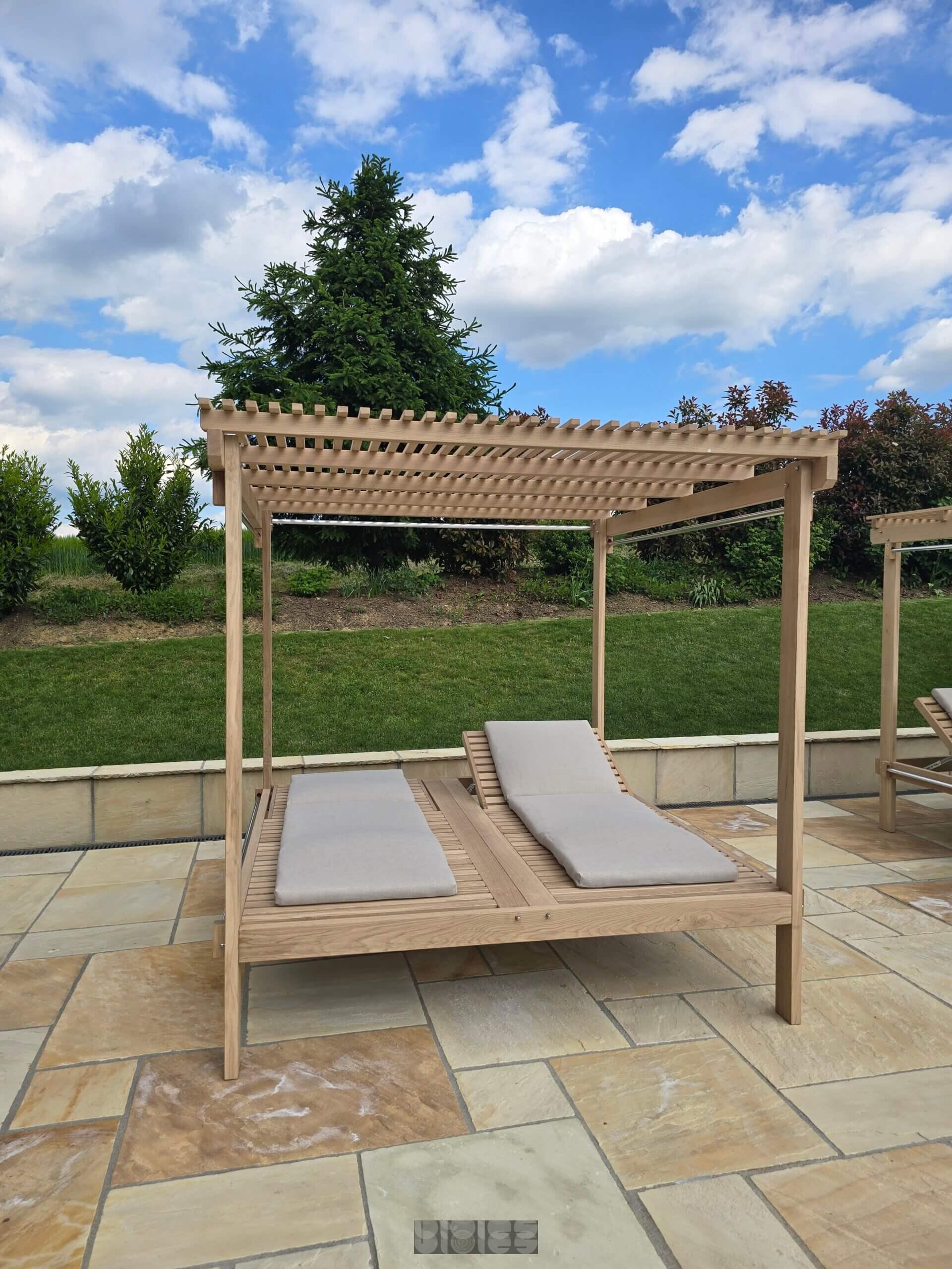 Ta ročno izdelan dvojni ležalnik z masivno pergolo združuje brezčasen dizajn, vrhunsko udobje in praktične detajle. Namenjen je zunanji uporabi in predstavlja idealno izbiro za sproščanje ob bazenu, na terasi ali na vrtu – tako v zasebnih kot profesionalnih okoljih.