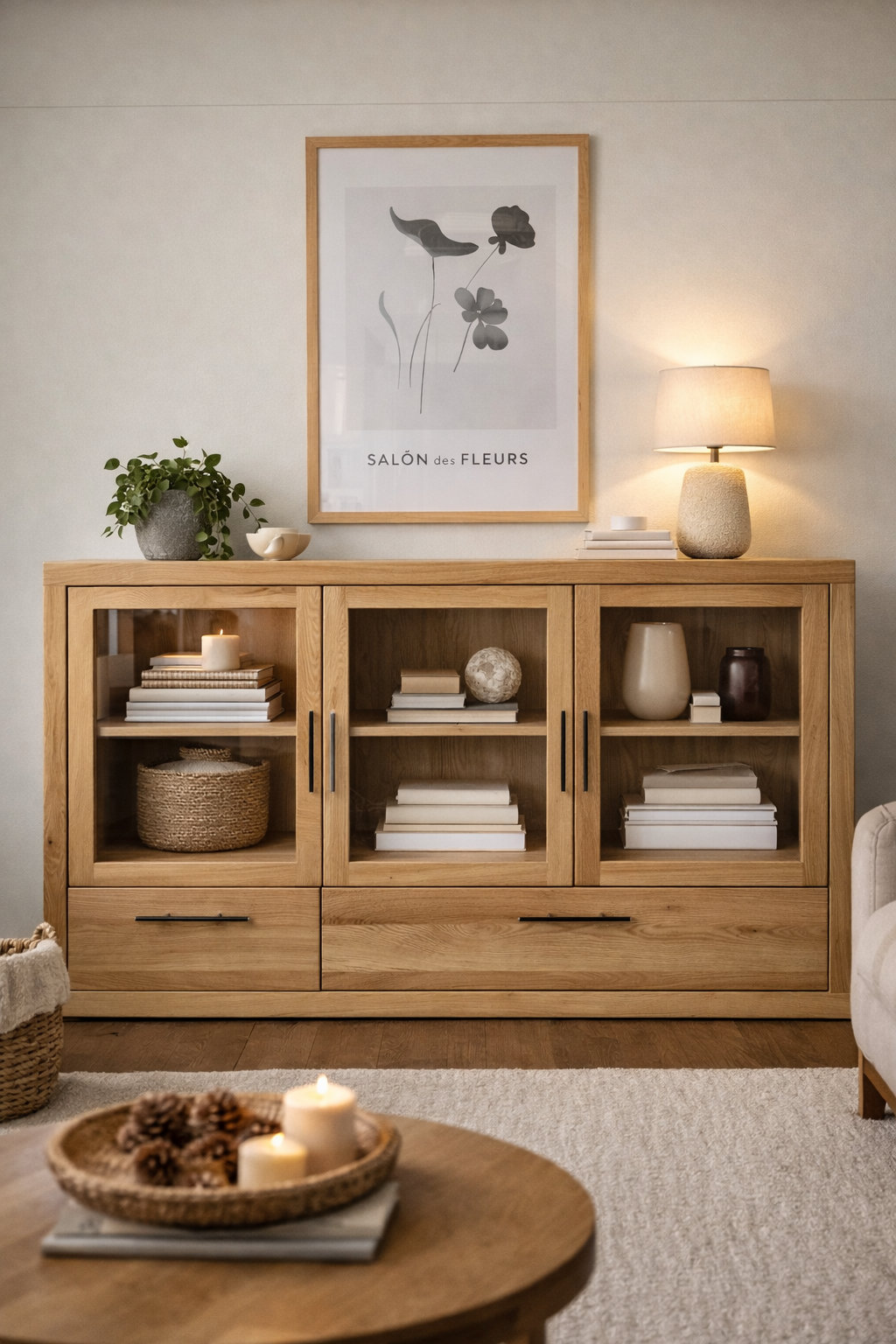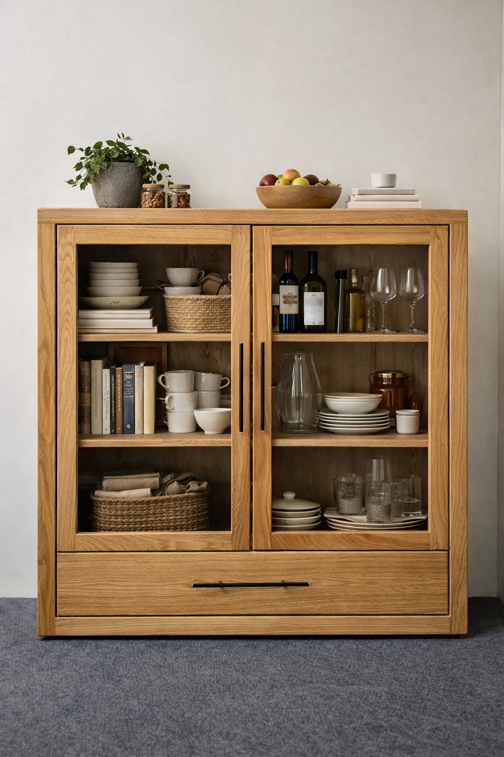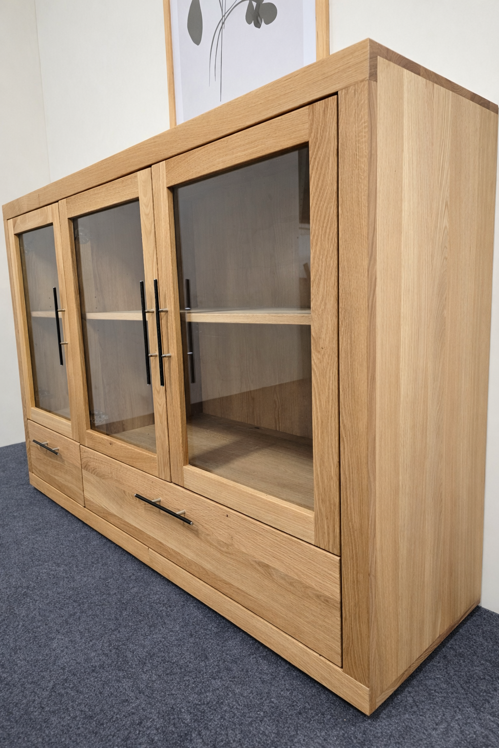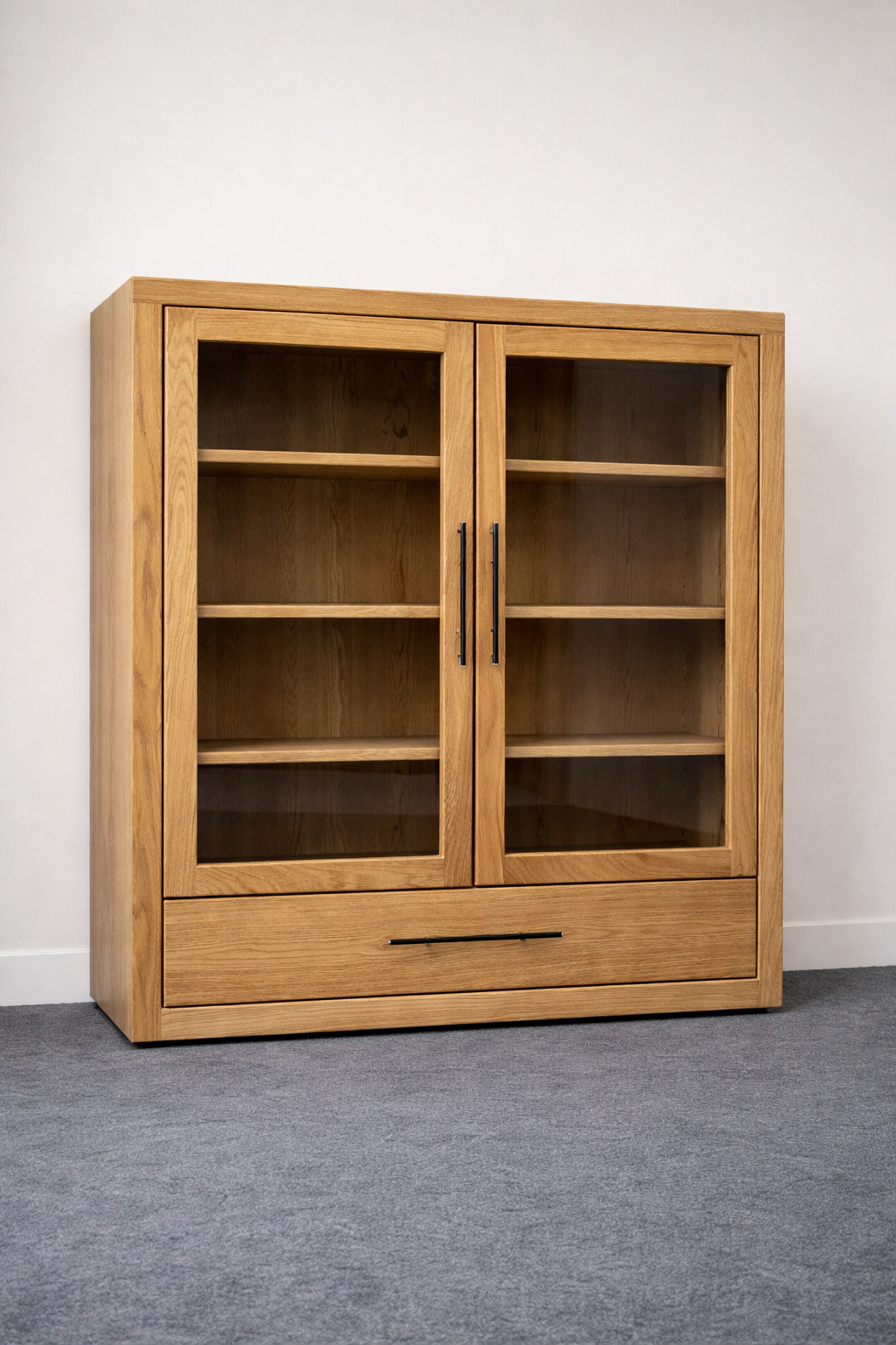 Ekskluzivna hrastova komoda s steklenimi vrati in karbon ročaji