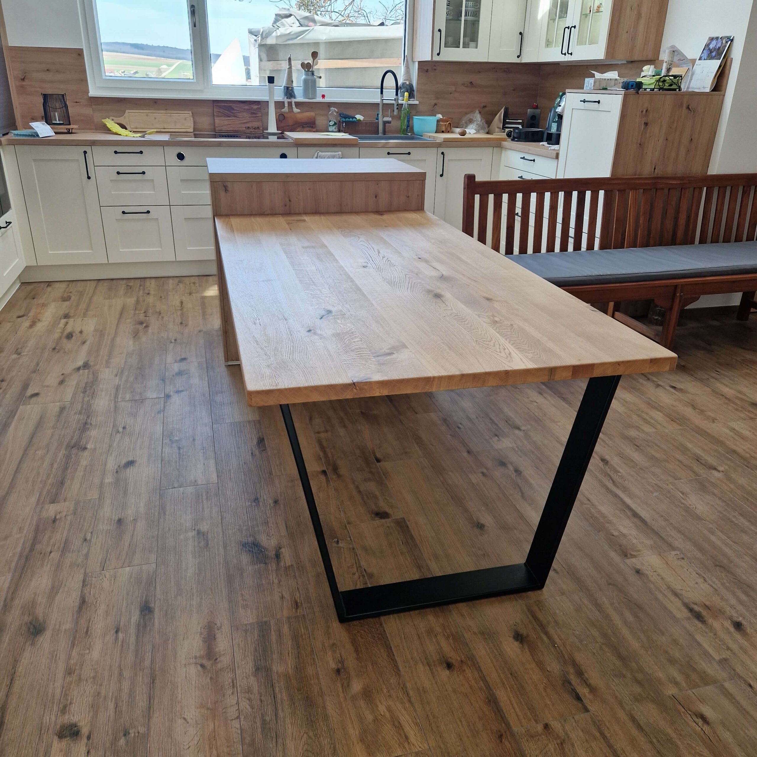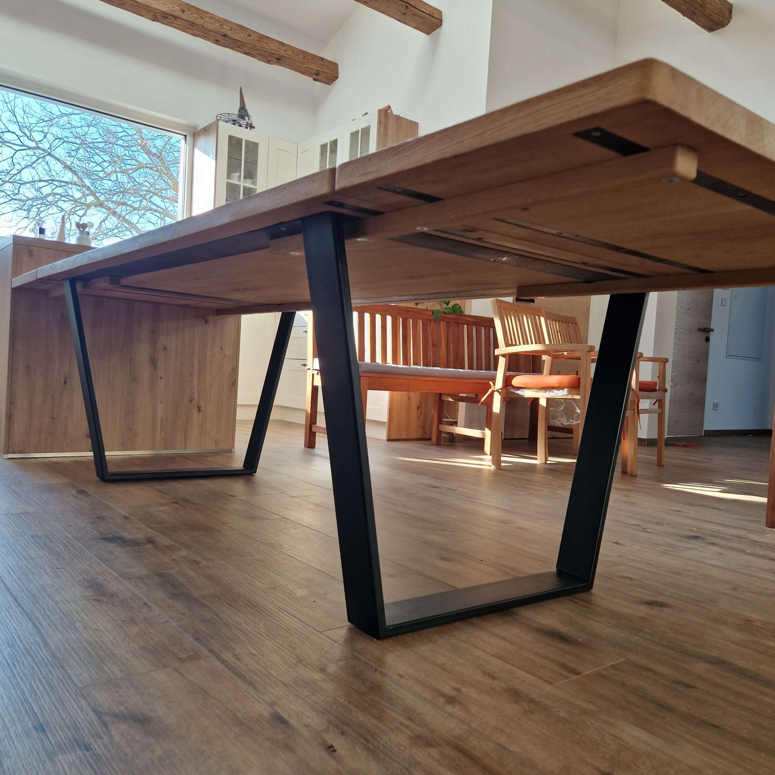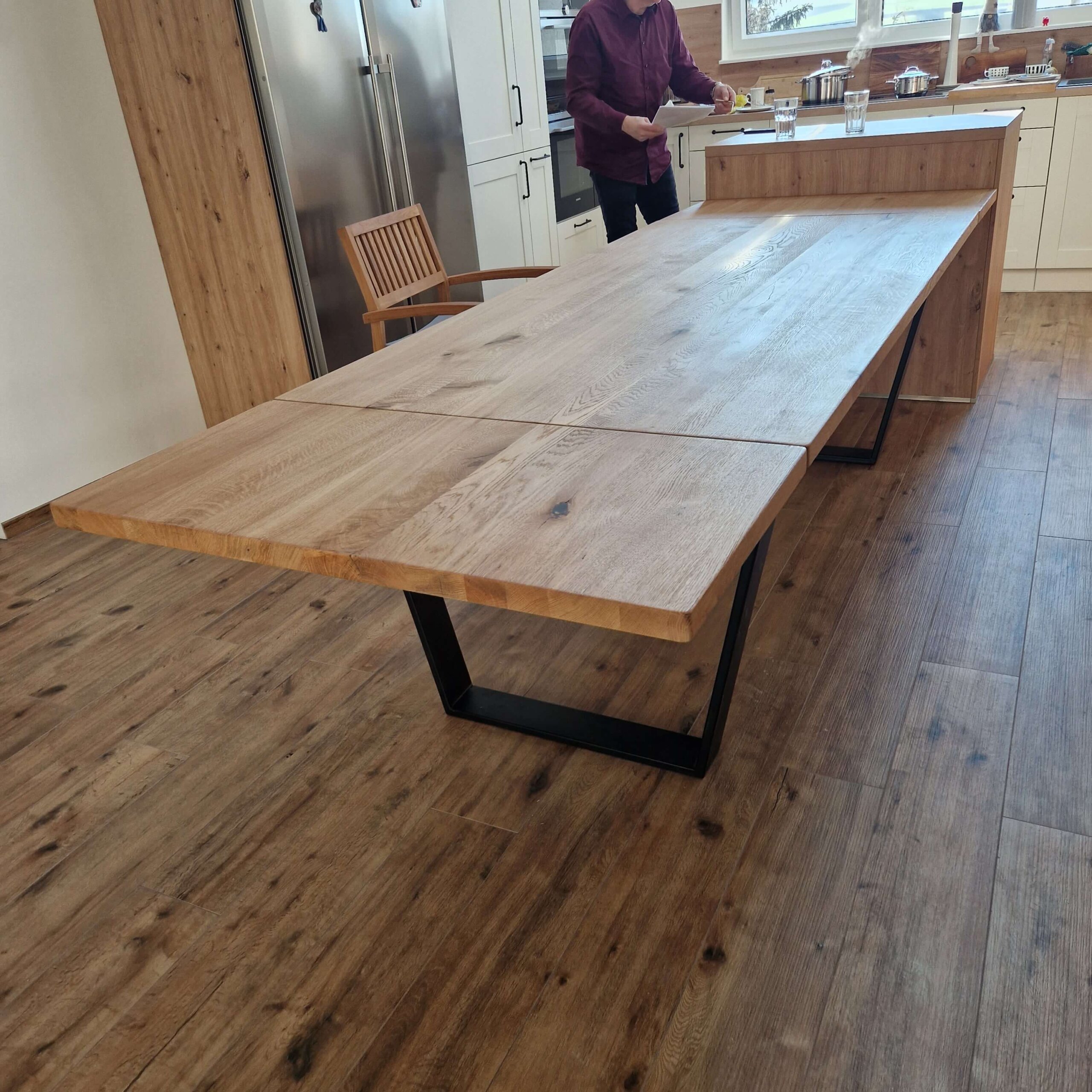 Miza na fotografijah je velikosti 200×100 cm, debelina 40 mm. Miza je narejena iz hrastovega izbranega lesa z grčami, zapolnjenimi z črnim polnilom. Miza ima elegantne kovinske noge profila 20x100mm. Miza se lahko enostavno podaljša, z namestitvijo podaljškov levo in desno kot prikazuje video.