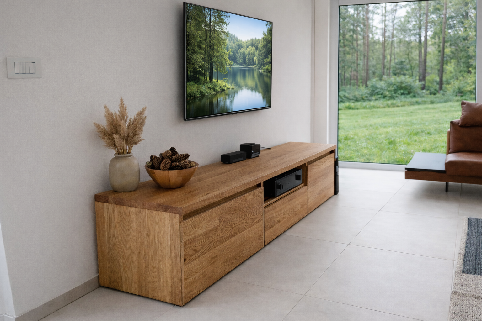 TV lowboard je izdelan iz masivnega hrasta, izbranega brez grč, kar mu daje miren, eleganten in sodoben videz. Površina je oljena, kar poudari naravno strukturo lesa, hkrati pa ohranja topel, naraven ton hrasta.