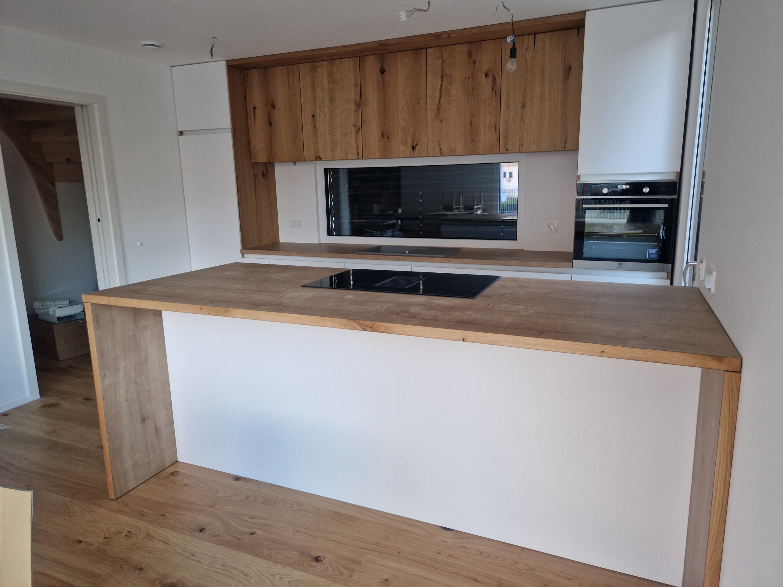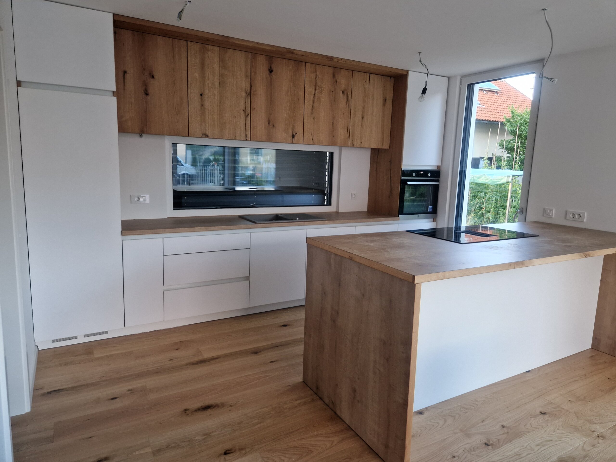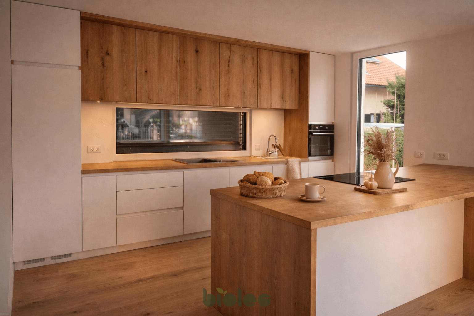 Kombinacija bele barve in naravnega hrasta je večna klasika, ki nikoli ne gre iz mode. Ta kuhinja združuje sodobno čistost belih linij s toplino masivnega lesa ter ustvarja prostor, ki je hkrati eleganten, domač in funkcionalen.