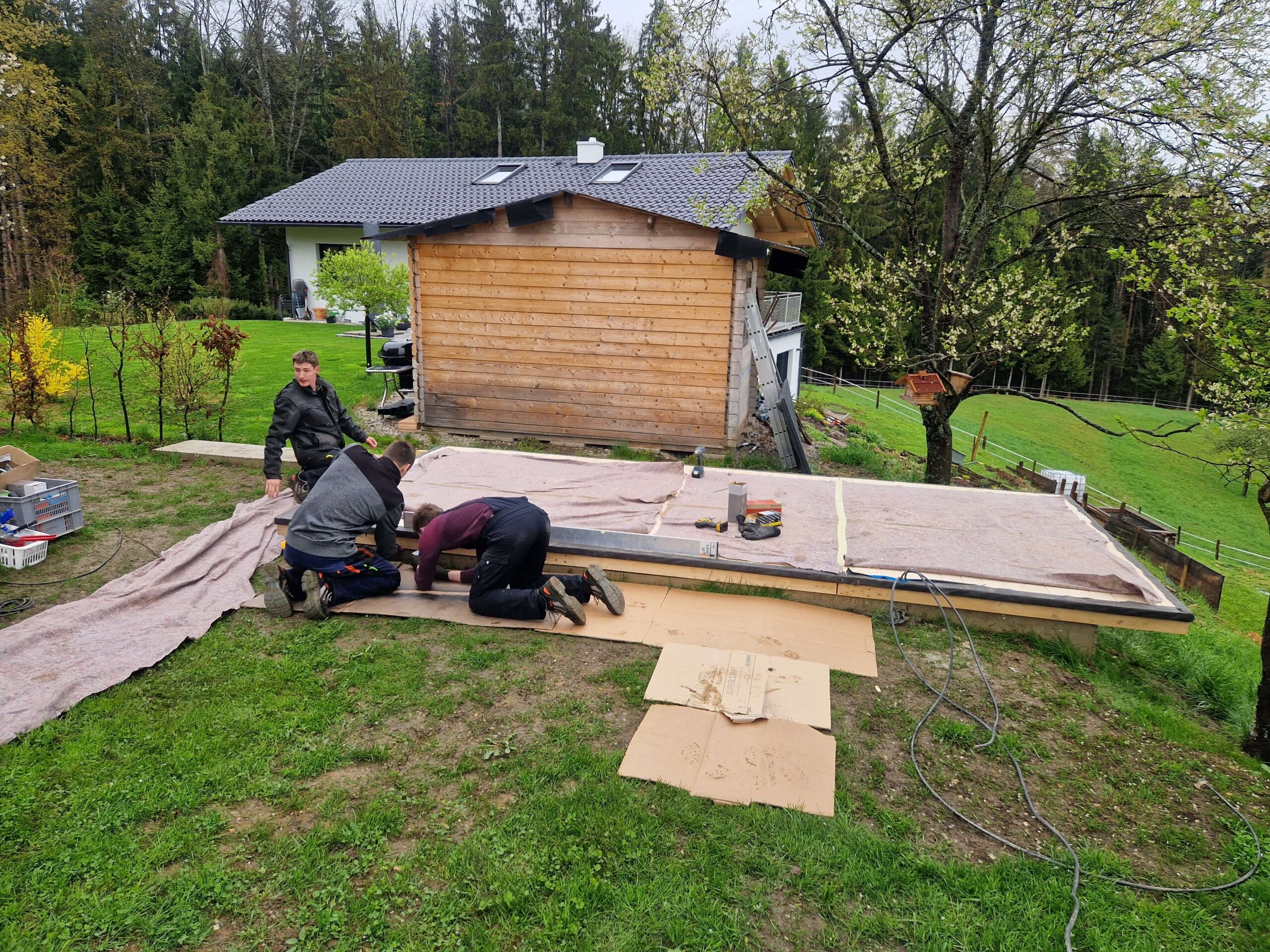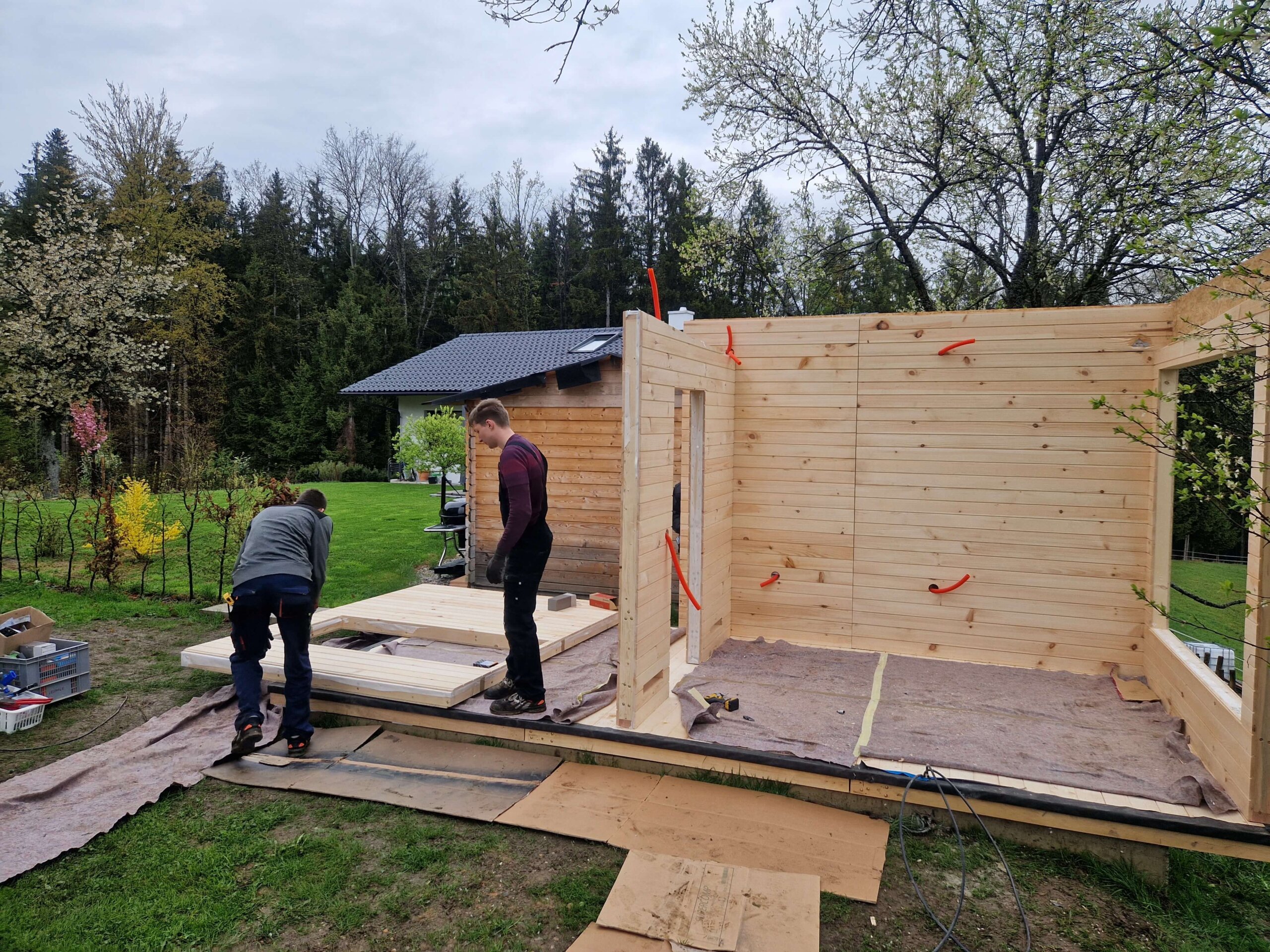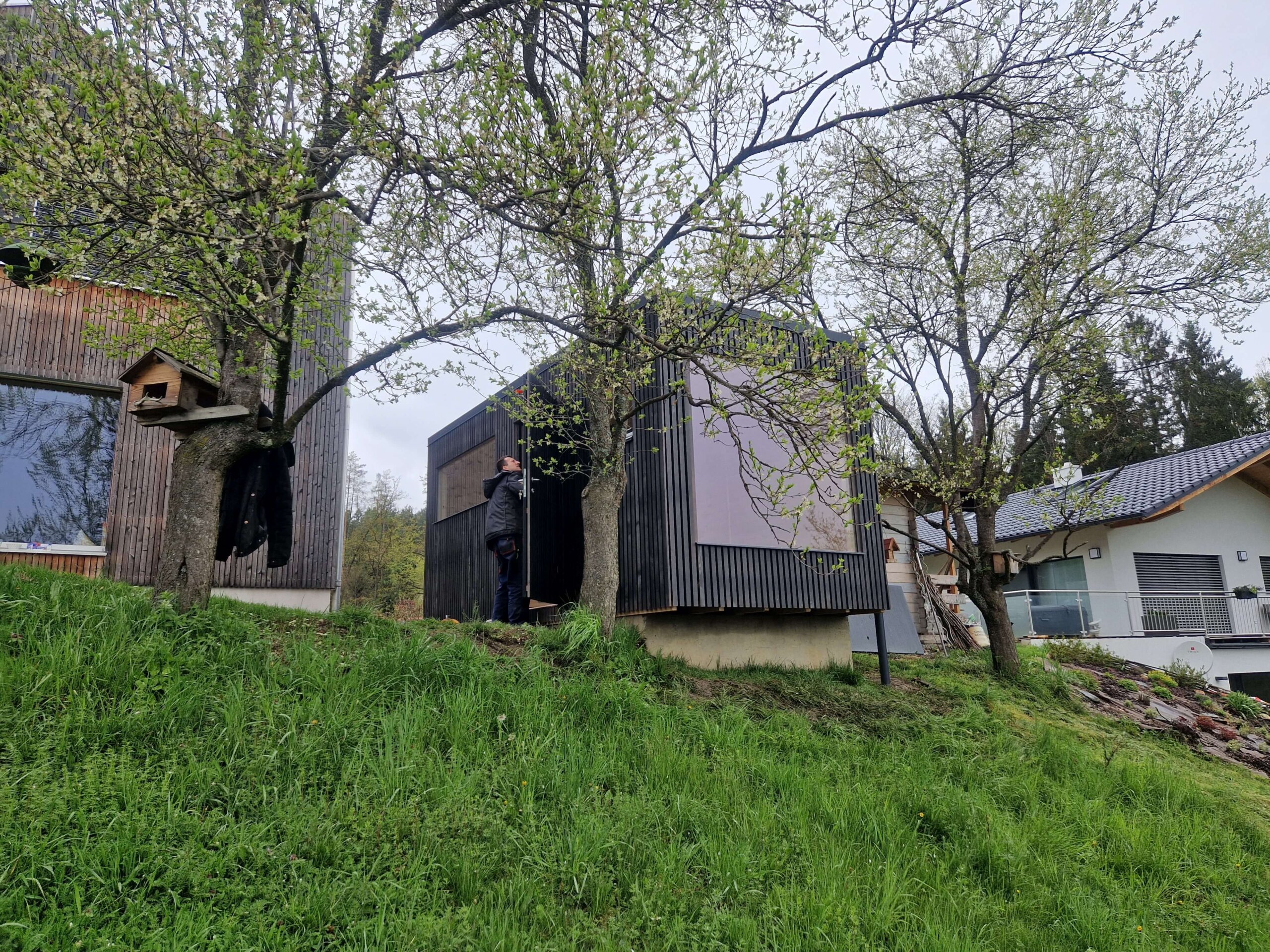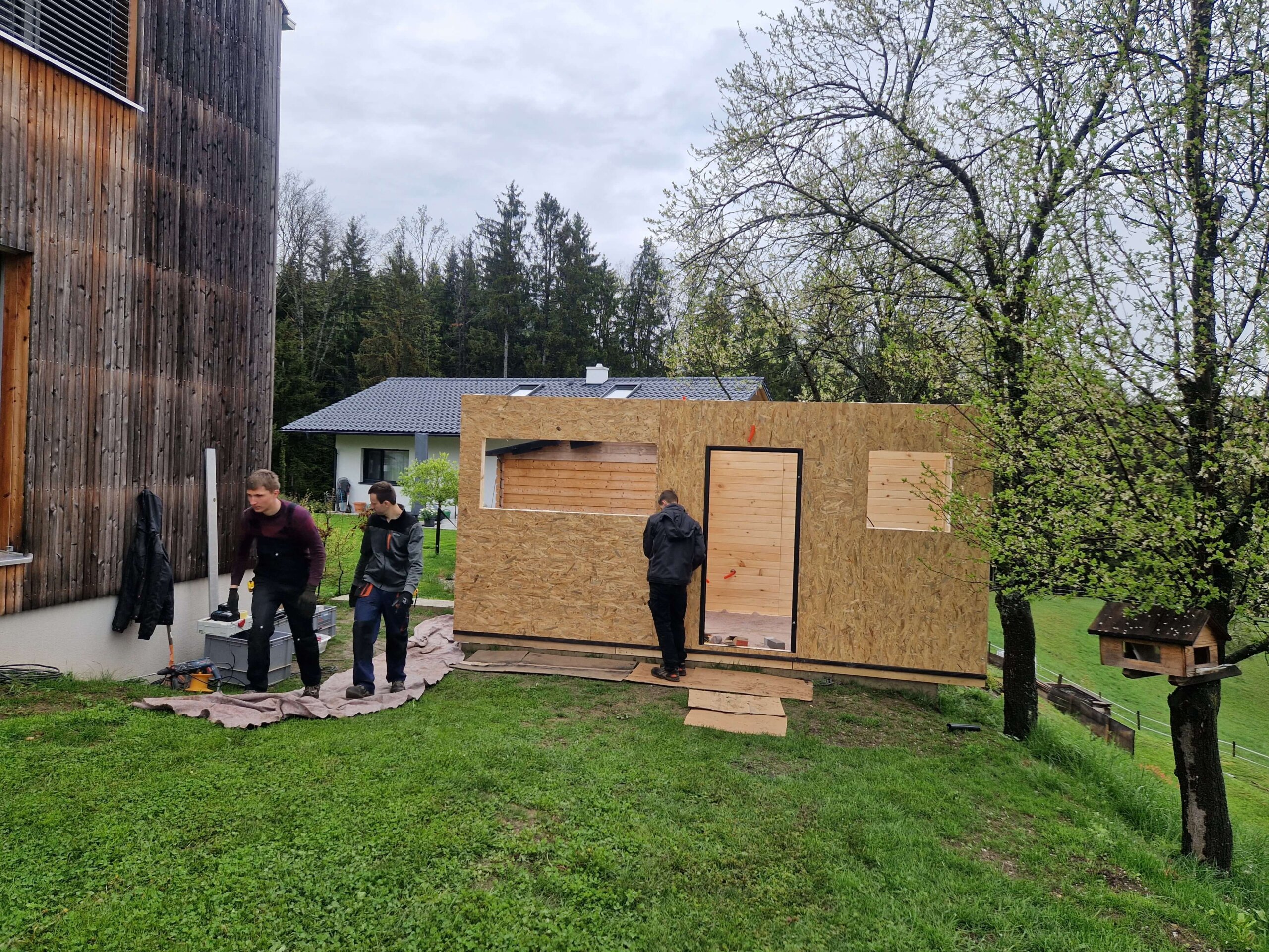 Hiša se v celoti konča pri nas v delavnici in jo pripeljemo z dvigalom ter samo razložimo na prej pripravljeno betonsko ploščo.
