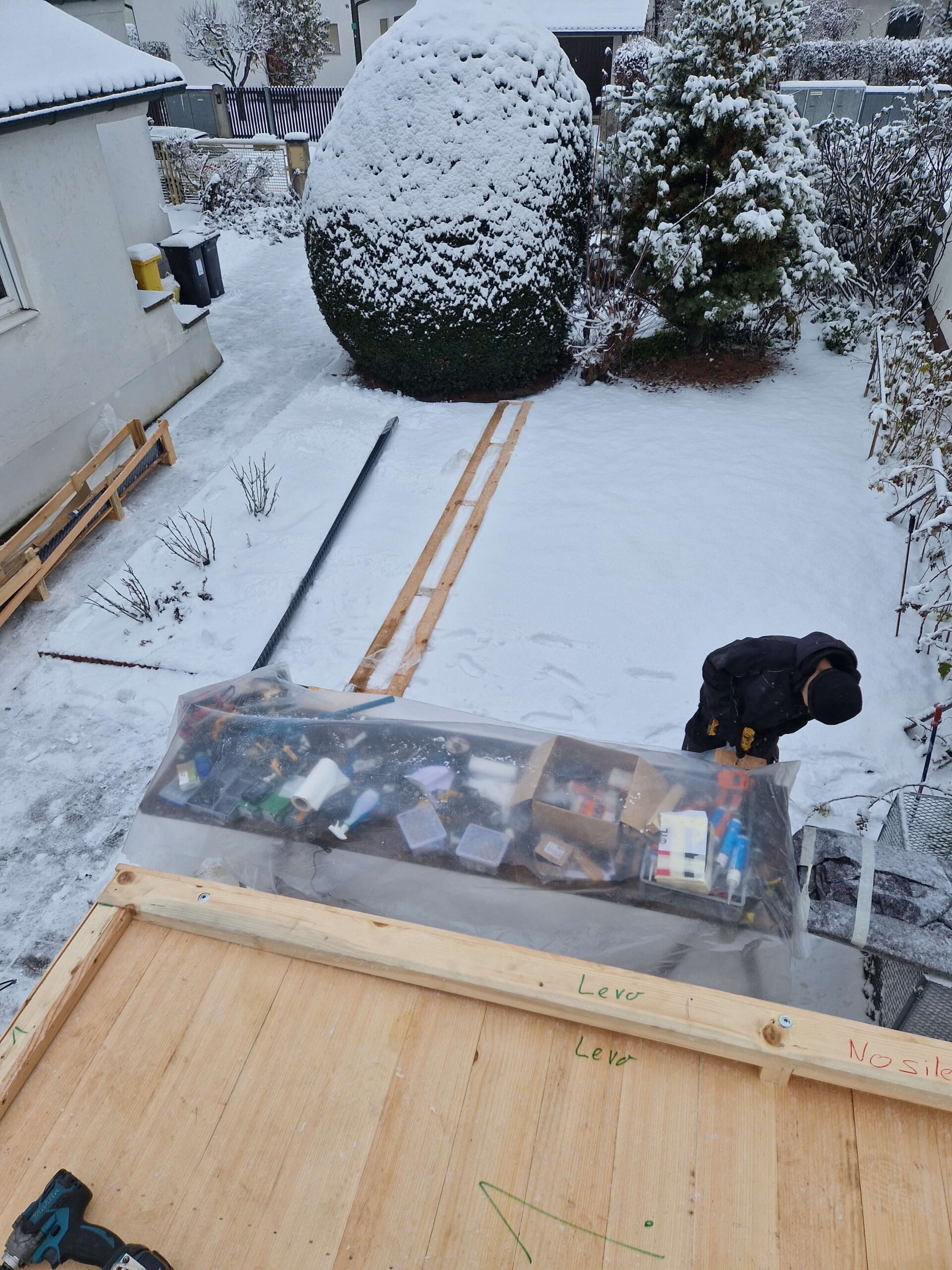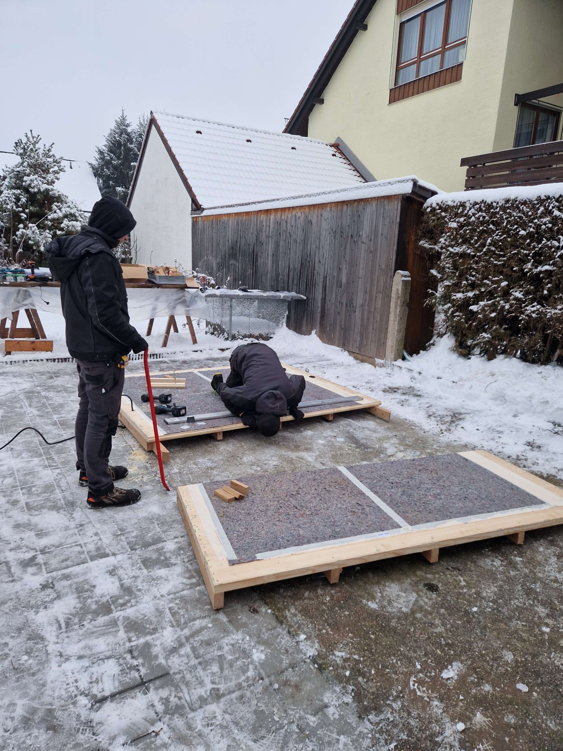 Hiša se v celoti konča pri nas v delavnici in jo pripeljemo z dvigalom ter samo razložimo na prej pripravljeno betonsko ploščo.